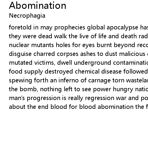 foretold in may prophecies global apocalypse has arrived those who lived, wish they were dead walk the live of life and death radiation that covers the skies nuclear mutants holes for eyes burnt beyond recognition melted flesh nature's disguise charred corpses ashes to dust malicious cries of unrelenting lust mutated victims, dwell underground contamination leads to starvation water and food supply destroyed chemical disease followed by diabolical unleashment spewing forth an inferno of carnage torn wasteland of rubbish and debris after the bomb, nothing left to see power hungry nations technology and science prove man's progression is really regression war and political violence have brought about the end blood for blood abomination the final godsend |