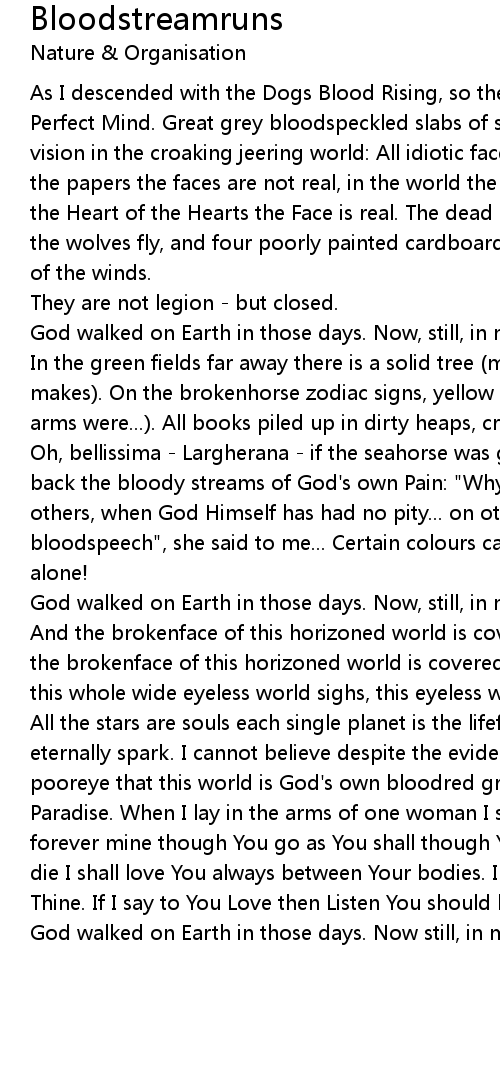 All the stars are souls each single planet is the lifeflame of the nothingy eternally spark. I cannot believe despite the evidence of one Godeye and one pooreye that this world is God's own bloodred grassgreen blueblack skypied Paradise. When I lay in the arms of one woman I said to her silent: "You will be forever mine though You go as You shall though You diediedie. Sleep as You shall die I shall love You always between Your bodies. I pray that I shall be forever Thine. If I say to You Love then Listen You should be crowned above all." |