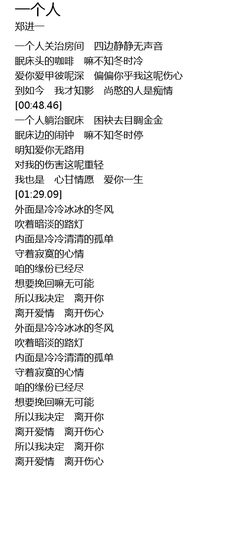 | [00:09.81] | 一个人关治房间 四边静静无声音 |