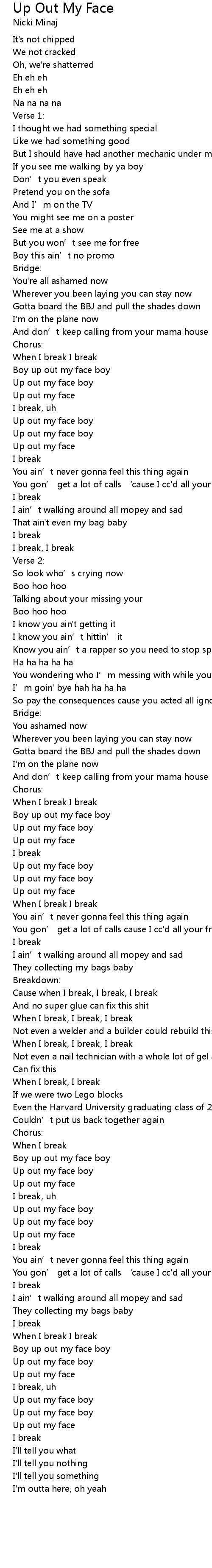 | Song | Up Out My Face |