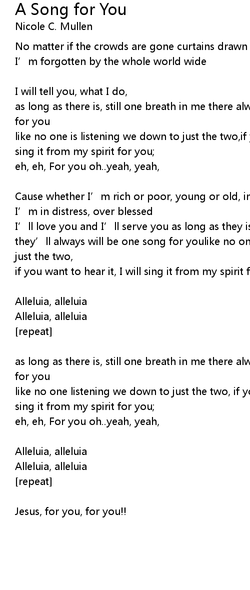 | I' ll love you and I' ll serve you as long as they is still one breath in me they' ll always will be one song for youlike no one is listening we down to just the two, | |
