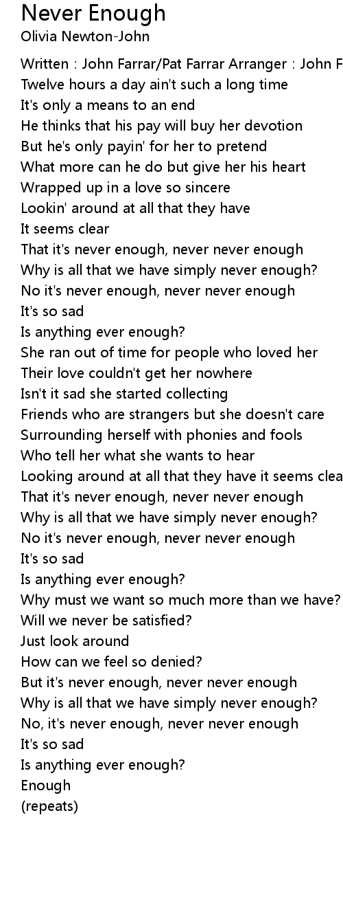 | But it' s never enough, never never enough | |