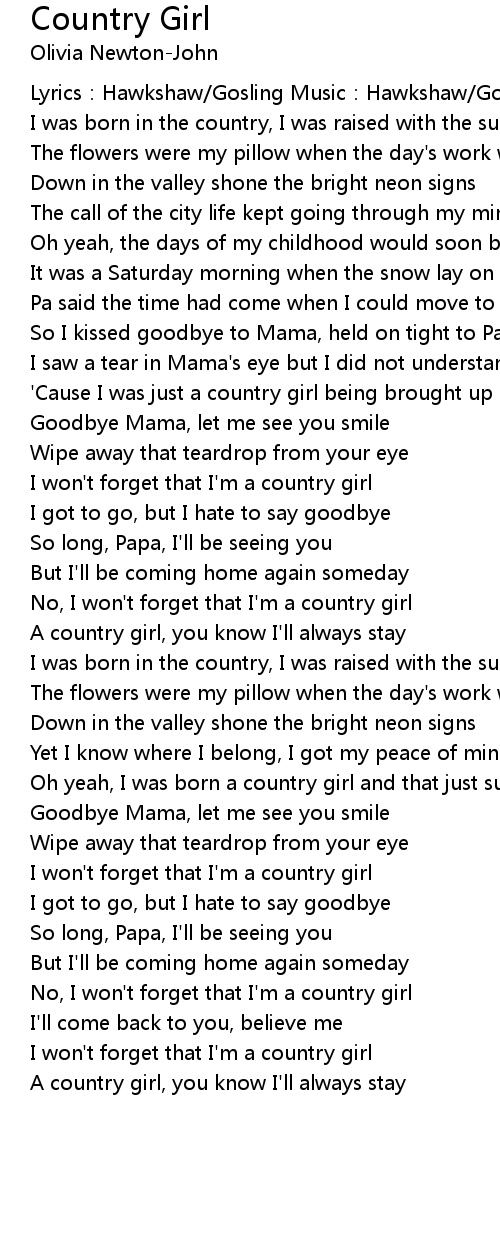 | Oh yeah, I was born a country girl and that just suits me fine | |