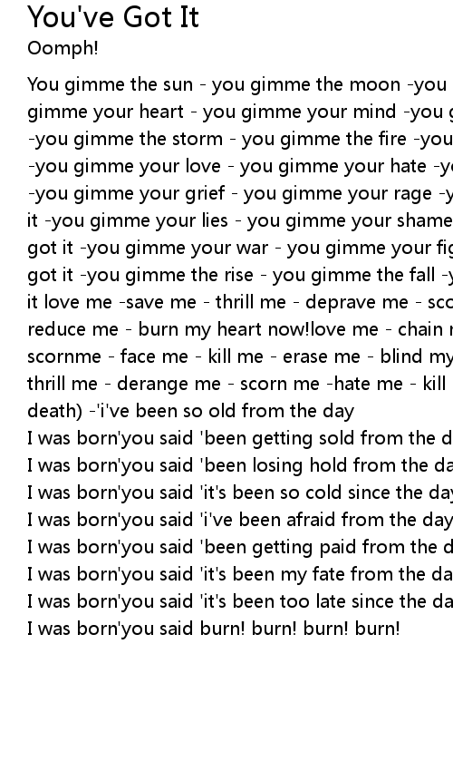You gimme the sun - you gimme the moon -you gimme the stars - you've got it -you gimme your heart - you gimme your mind -you gimme your scars - you've got it -you gimme the storm - you gimme the fire -you gimme the rain - you've got it -you gimme your love - you gimme your hate -you gimme your pain - you've got it -you gimme your grief - you gimme your rage -you gimme your fears - you've got it -you gimme your lies - you gimme your shame -you gimme your tears - you've got it -you gimme your war - you gimme your fight -you gimme your peace - you've got it -you gimme the rise - you gimme the fall -you gimme release - you've got it love me -save me - thrill me - deprave me - scorn me -use me - kill me - reduce me - burn my heart now!love me - chain me - thrill me - restrain me - scornme - face me - kill me - erase me - blind my eyes now!love me - change me - thrill me - derange me - scorn me -hate me - kill me - cremate me - (love me to death) -'i've been so old from the day |