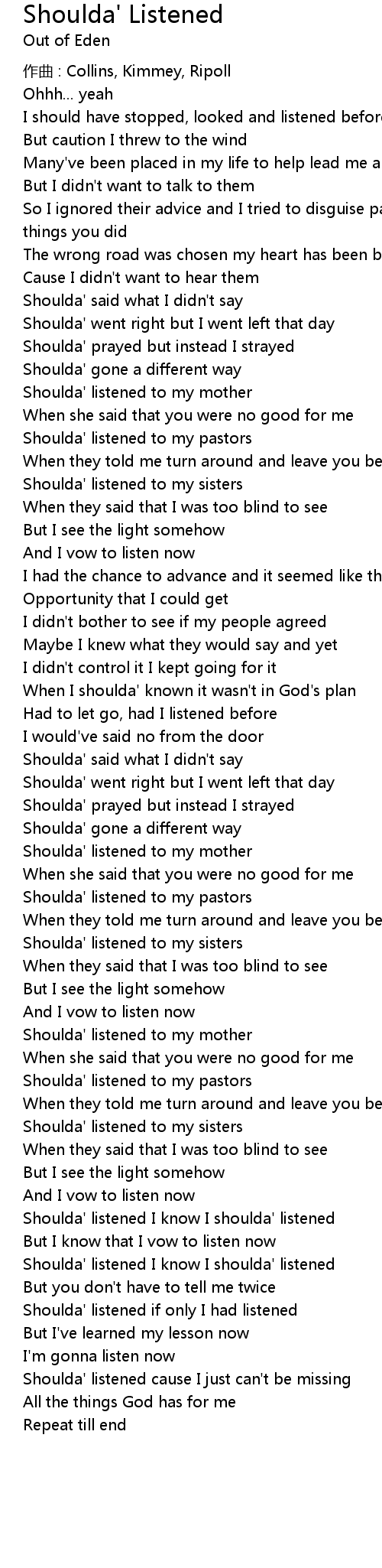 | Shoulda' listened I know I shoulda' listened | |