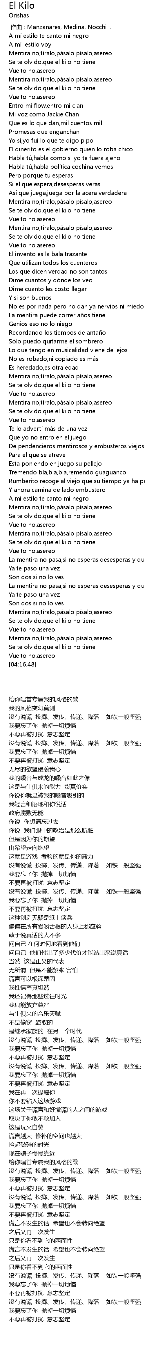 | [03:18.18] | Se te olvido,que el kilo no tiene |