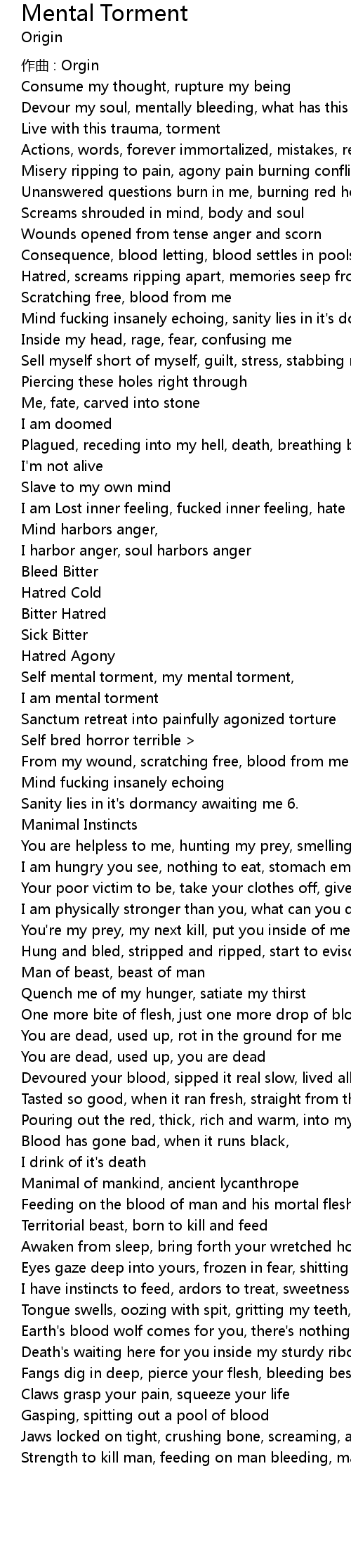| Unanswered questions burn in me, burning red hot mental torment | |