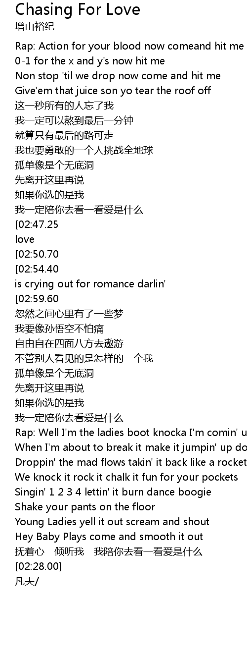 | [03:04.45][02:47.25][02:31.00][01:43.75][00:50.70] | Oh baby you got me chasing for love |