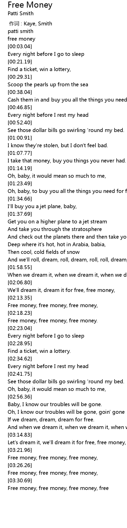 | [03:22.96] | Free money, free money, free money, |