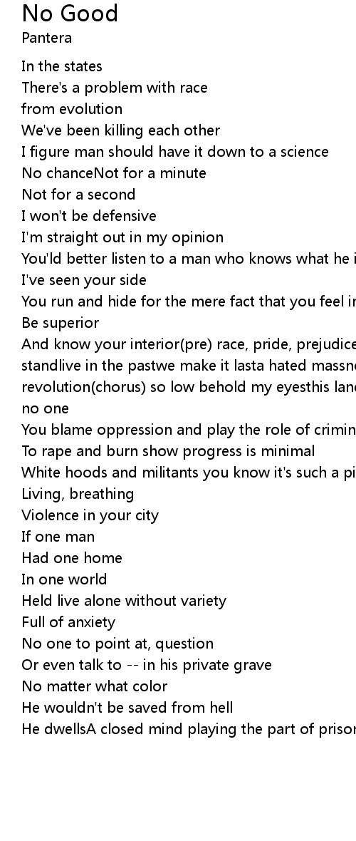 And know your interior(pre) race, pride, prejudiceblack man, white manno standlive in the pastwe make it lasta hated massno solutionmind pollutionfor revolution(chorus) so low behold my eyesthis land of fools will riseno goodfor no one |