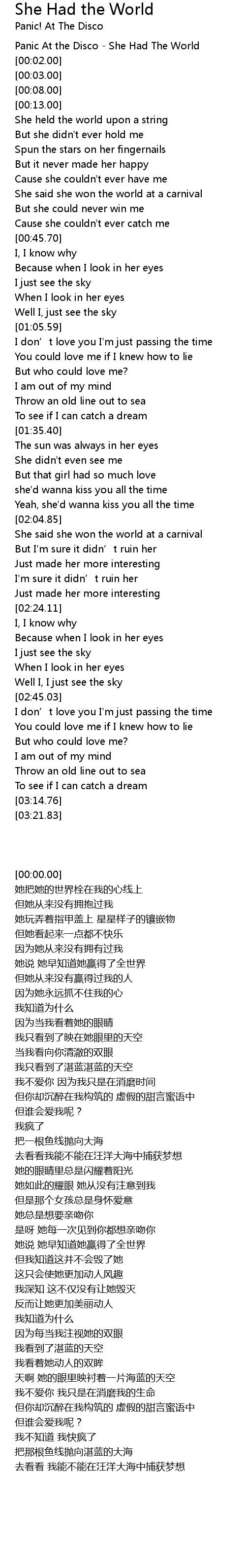 | [00:00.00] | Panic At the Disco - She Had The World |