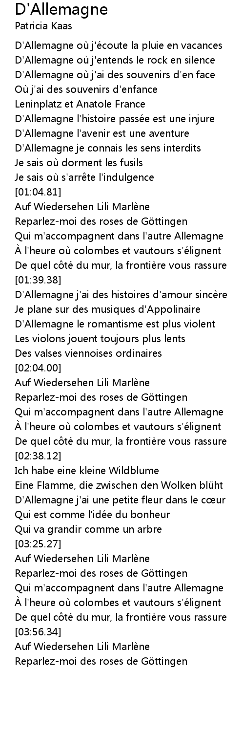 | [01:40.50] | D' Allemagne j' ai des histoires d' amour since re |