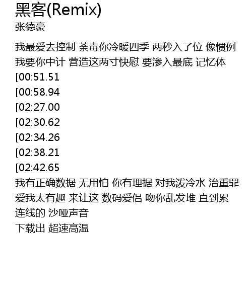 | [03:22.42][02:27.00][01:06.25] | 连线的沙哑声音 黑客在狂号 |