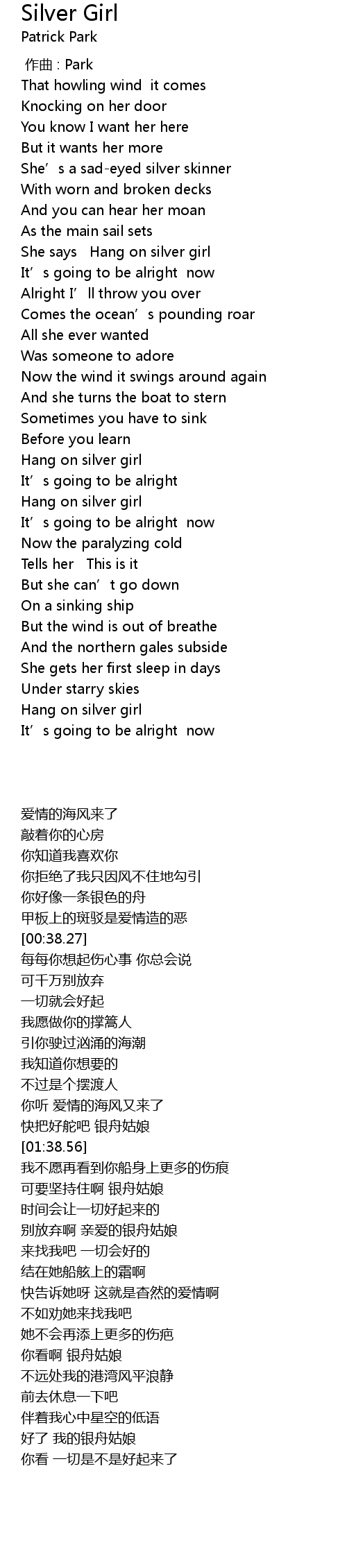 | [00:45.33] | She says Hang on silver girl |