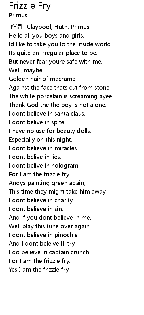 | [00:00.00] | 作词 : Claypool, Huth, Primus |