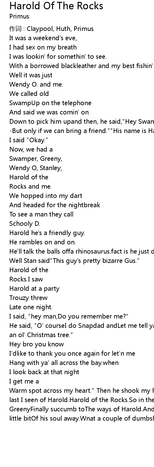 | Down to pick him upand then, he said," Hey Swampy, me and Greeny' ll come along But only if we can bring a friend."" His name is Harold." | |