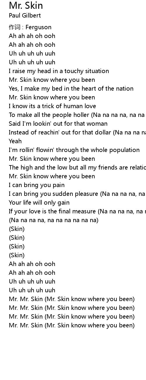 | Mr. Mr. Skin Mr. Skin know where you been | |
