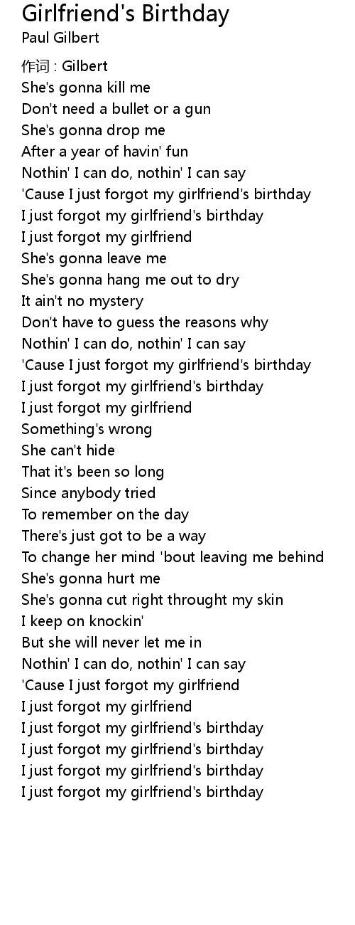 | 'Cause I just forgot my girlfriend's birthday | |