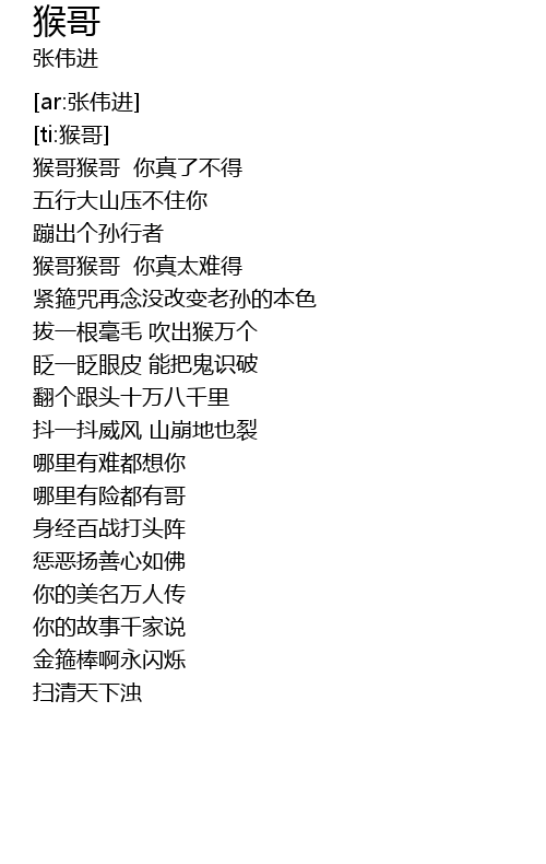 | [00:14.24] | 猴哥猴哥 你真了不得 |