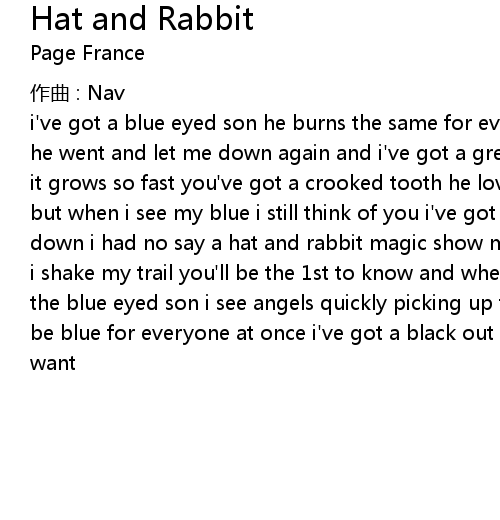 | i' ve got a blue eyed son he burns the same for every one i had a new best friend he went and let me down again and i' ve got a green green grass it grows so tall it grows so fast you' ve got a crooked tooth he loves you straighter then i do but when i see my blue i still think of you i' ve got a black out name hand me down i had no say a hat and rabbit magic show magic man wont let me go but when i shake my trail you' ll be the 1st to know and when you wag your tail look at the blue eyed son i see angels quickly picking up their guns how could the sky be blue for everyone at once i' ve got a black out name it can' t be the one you want |