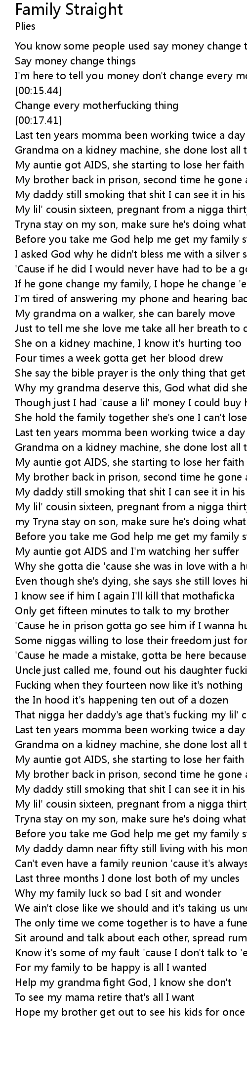 [01:33.71] My auntie got AIDS, she starting to lose her faith