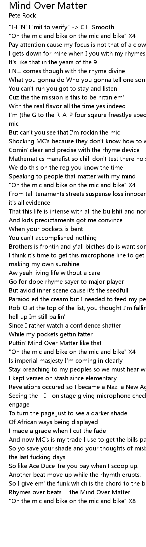 Rhymes over beats = the Mind Over Matter |