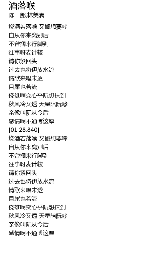 | [01:40.329] | 烧酒若落喉 又搁想要哮 |