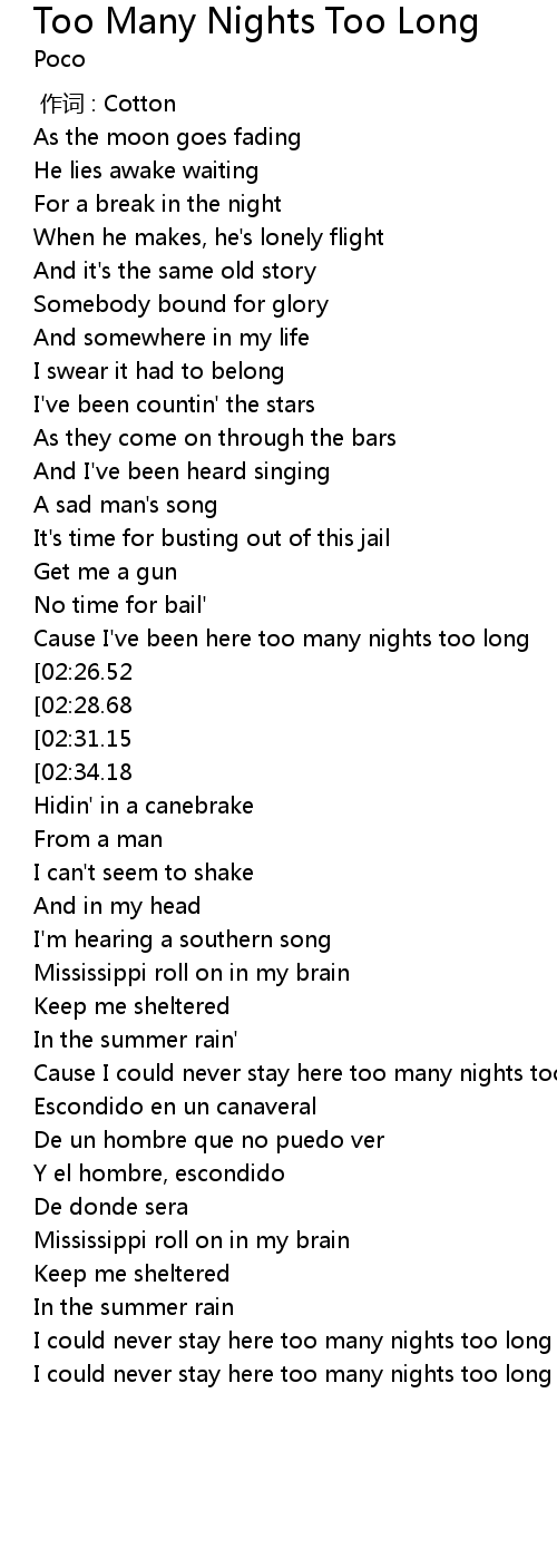 | [02:11.83] | Cause I've been here too many nights too long |
