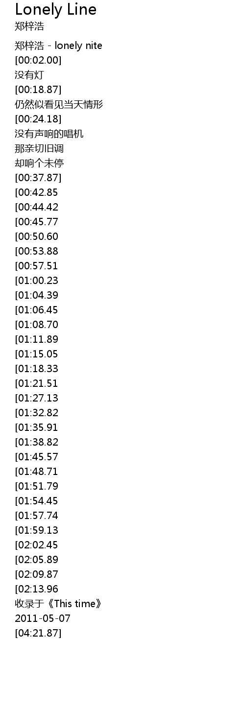 | [00:00.00] | 郑梓浩 - lonely nite |