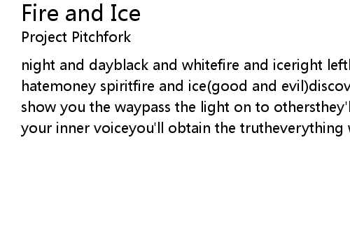 | night and dayblack and whitefire and iceright lefthard softfire and icelove hatemoney spiritfire and ice(good and evil)discover the lightin you heartit will show you the waypass the light on to othersthey'll illuminate the nightlisten to your inner voiceyou'll obtain the trutheverything will change |