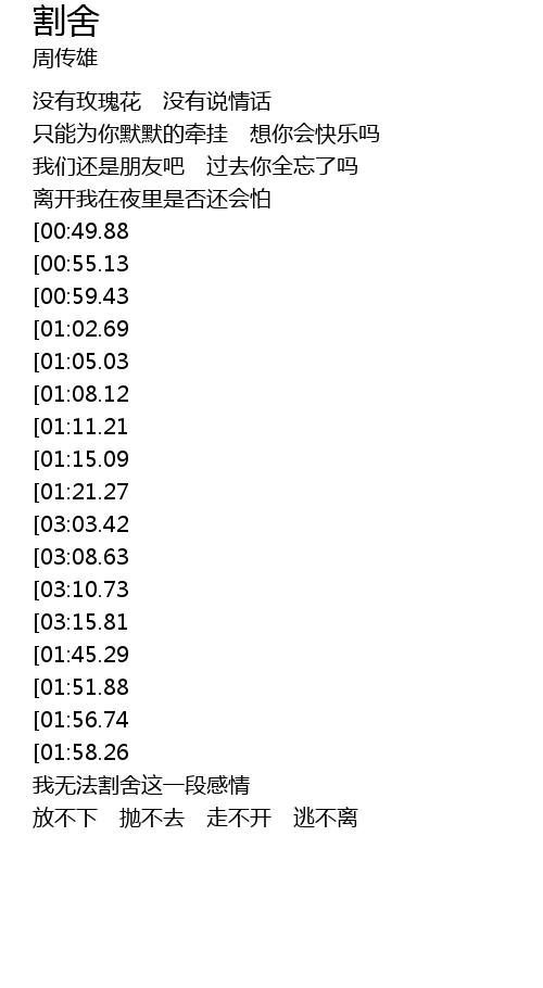 | [04:04.17][03:15.81][01:39.16] | 教我怎么能割舍这一段感情 |