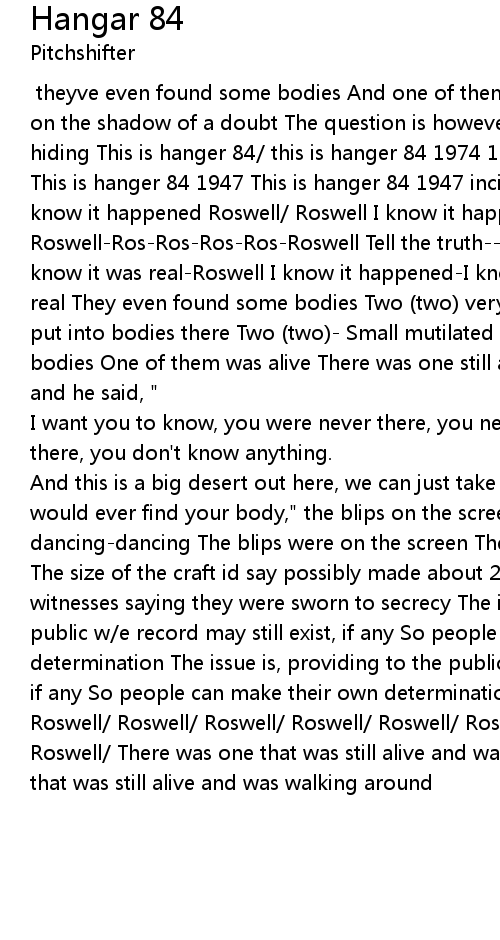 theyve even found some bodies And one of them was alive We can show that to be on the shadow of a doubt The question is however The question is what were they hiding This is hanger 84/ this is hanger 84 1974 1974 This is hanger 84 1947 This is hanger 84 1947 This is hanger 84 1947 incident I know it happened/ I know it happened Roswell/ Roswell I know it happened/ I know it happened Roswell-Ros-Ros-Ros-Ros-Roswell Tell the truth---Roswell I know it happened I know it was real-Roswell I know it happened-I know it was real The threats were real They even found some bodies Two (two) very- Small mutilated bodie They were put into bodies there Two (two)- Small mutilated bodies They even found some bodies One of them was alive There was one still alive and was walking around and he said, " |