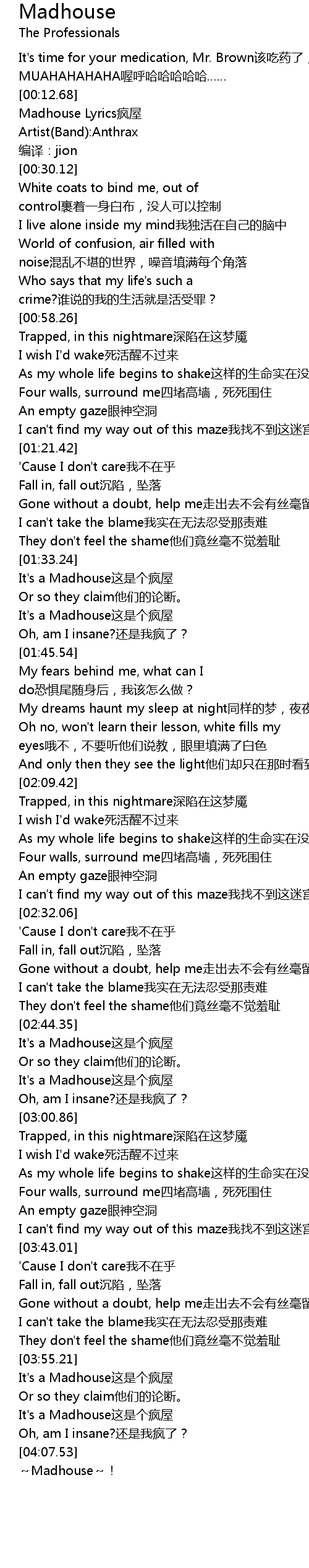 | [04:02.02] | It's a Madhouse这是个疯屋 |