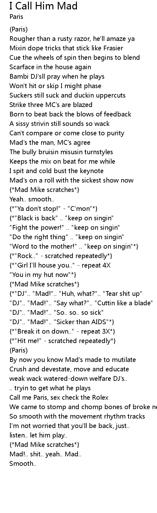 {*"DJ".. "Mad!".. "Huh, what?".. "Tear shit up" |