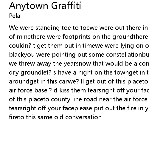 We were standing toe to toewe were out there in the snowyou looked like a friend of minethere were footprints on the groundthere were songs in my mouthbut i couldn? t get them out in timewe were lying on our backsand the sky went blackyou were pointing out some constellationbut will you whisper in my earhow we threw away the yearsnow that would be a conversationdrown with a pencil on dry groundlet? s have a night on the townget in this car and we? lldrive aroundget in this carwe? ll get out of this placeto county line road near the air force basei? d kiss them tearsright off your faceget in this carand get out of this placeto county line road near the air force basei? d kiss them tearsright off your faceplease put out the fire in your mindplease put out the fireto this same old conversation |