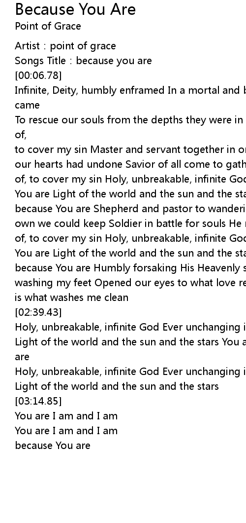 | [00:32.74] | to cover my sin Master and servant together in one Come to redeem what our hearts had undone Savior of all come to gather His kin Because of, in spite of, to cover my sin Holy, unbreakable, infinite God Ever unchanging in all that You are Light of the world and the sun and the stars You are I am and I am because You are Shepherd and pastor to wandering sheep Gave up His life so our own we could keep Soldier in battle for souls He might win Because of, in spite of, to cover my sin Holy, unbreakable, infinite God Ever unchanging in all that You are Light of the world and the sun and the stars You are I am and I am because You are Humbly forsaking His Heavenly seat Beaten and bloodied and washing my feet Opened our eyes to what love really means The blood on my hands is what washes me clean |