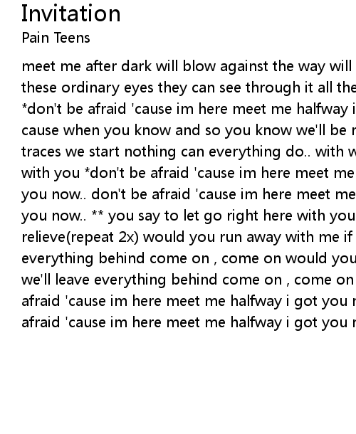 meet me after dark will blow against the way will fight for us to see the city these ordinary eyes they can see through it all they can see through it all *don't be afraid 'cause im here meet me halfway i got you now.. i got you now.. cause when you know and so you know we'll be right here forever the grace , the traces we start nothing can everything do.. with wounds to mend nothing to do with you *don't be afraid 'cause im here meet me halfway i got you now.. i got you now.. don't be afraid 'cause im here meet me halfway i got you now.. i got you now.. ** you say to let go right here with you if you trust and you need to relieve(repeat 2x) would you run away with me if its tonight? we'll leave everything behind come on , come on would you run away with me if its tonight? we'll leave everything behind come on , come on (we'll live life!) *don't be afraid 'cause im here meet me halfway i got you now.. i got you now.. don't be afraid 'cause im here meet me halfway i got you now.. i got you now.. - e n d - |