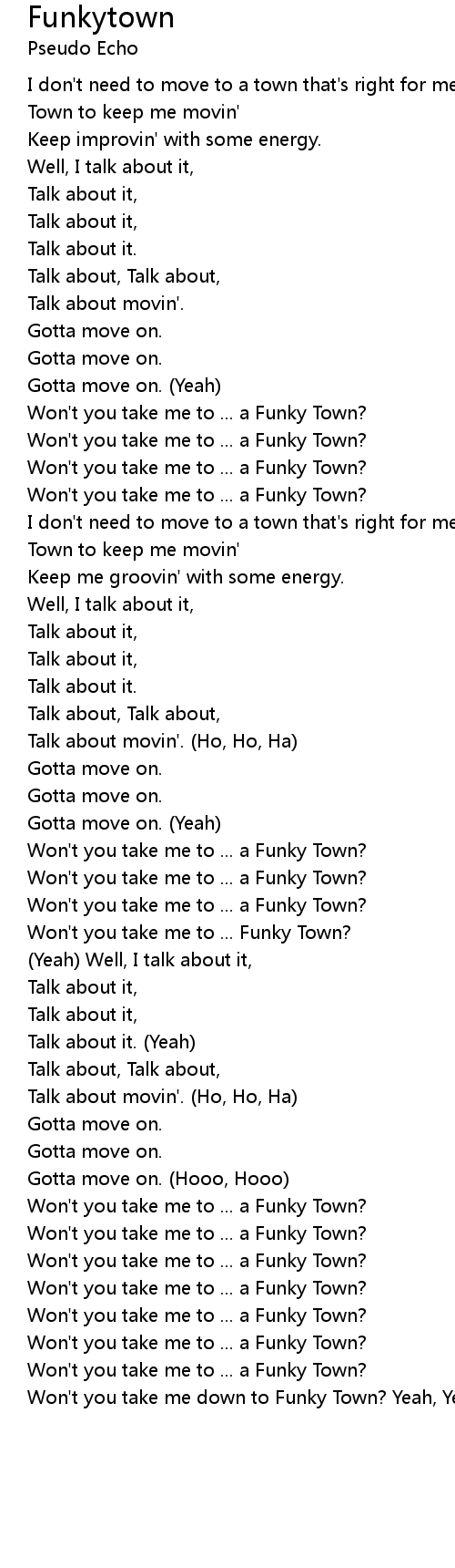 Won't you take me down to Funky Town? Yeah, Yeah (C'mon) |