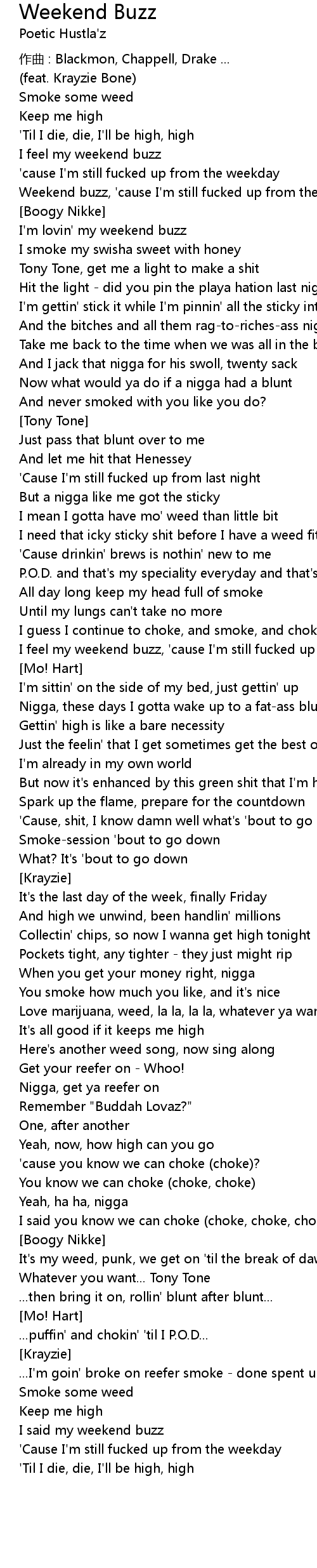 | I feel my weekend buzz, ' cause I' m still fucked up from the weekday | |
