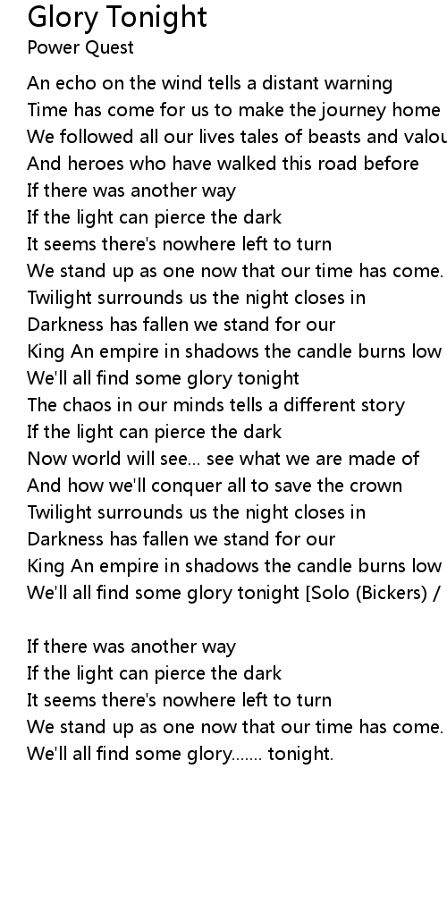 We'll all find some glory tonight [Solo (Bickers) / Solo (Williams) / Solo (Bickers) / Solo (Totman)] |
