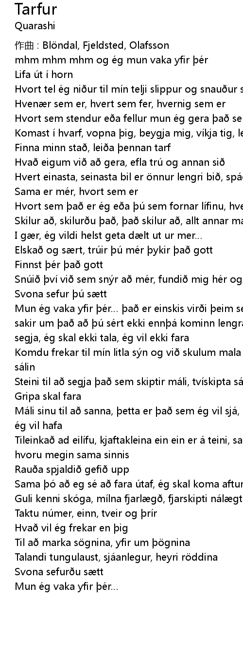 | Mun ég vaka yfir þér… það er einskis virði þeim sem í haus um stundar sakir um það að þú sért ekki ennþá kominn lengra af stað ég skal ekki segja, ég skal ekki tala, ég vil ekki fara | |