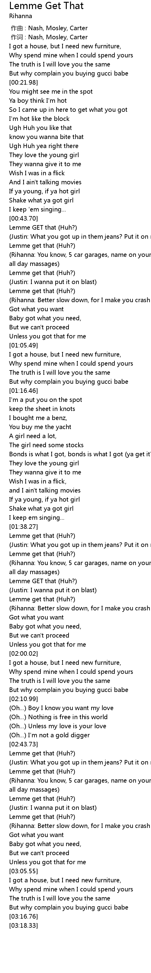 | [00:50.37] | Rihanna: You know, 5 car garages, name on your bank account, |