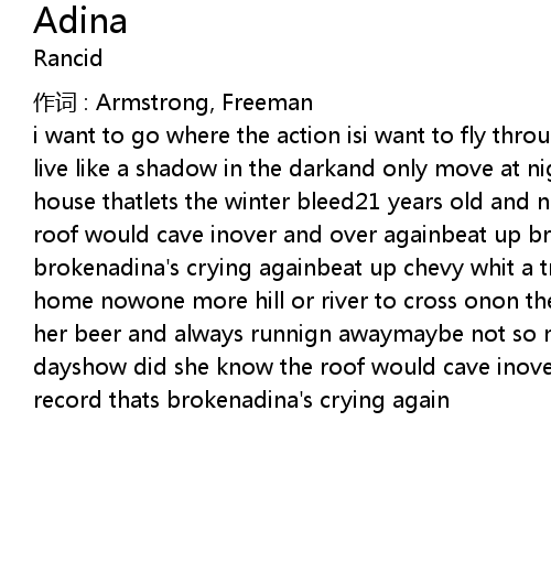 | i want to go where the action isi want to fly through the urban blighti want to live like a shadow in the darkand only move at nighta story bought a one story house thatlets the winter bleed21 years old and no moneyhow did she know the roof would cave inover and over againbeat up bruised a record thats brokenadina's crying againbeat up chevy whit a triler in towis what they call home nowone more hill or river to cross onon the way to another towncrying in her beer and always runnign awaymaybe not so much running but hopinfor better dayshow did she know the roof would cave inover and over againbeat up bruised a record thats brokenadina's crying again |