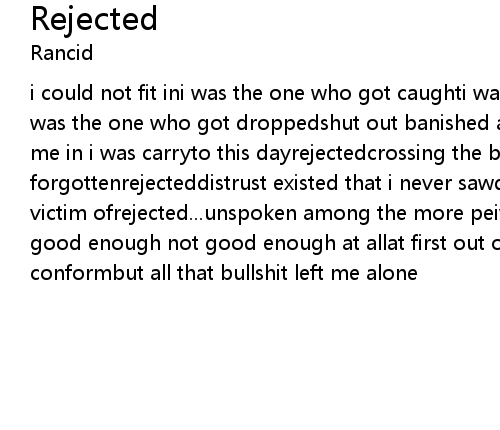 i could not fit ini was the one who got caughti was the one who got realizedi was the one who got droppedshut out banished and locked awaythe knife that did me in i was carryto this dayrejectedcrossing the bridges in the land of the forgottenrejecteddistrust existed that i never sawdeep seated trust i was a victim ofrejected...unspoken among the more peiveliged or the so calledi was not good enough not good enough at allat first out of lonliness i tried to conformbut all that bullshit left me alone |