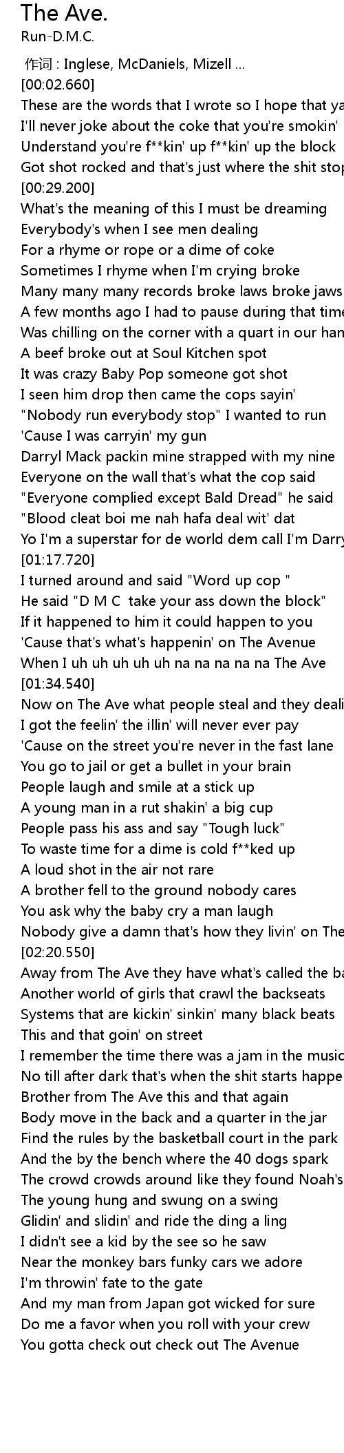 | [01:20.480] | He said " D M C take your ass down the block" |
