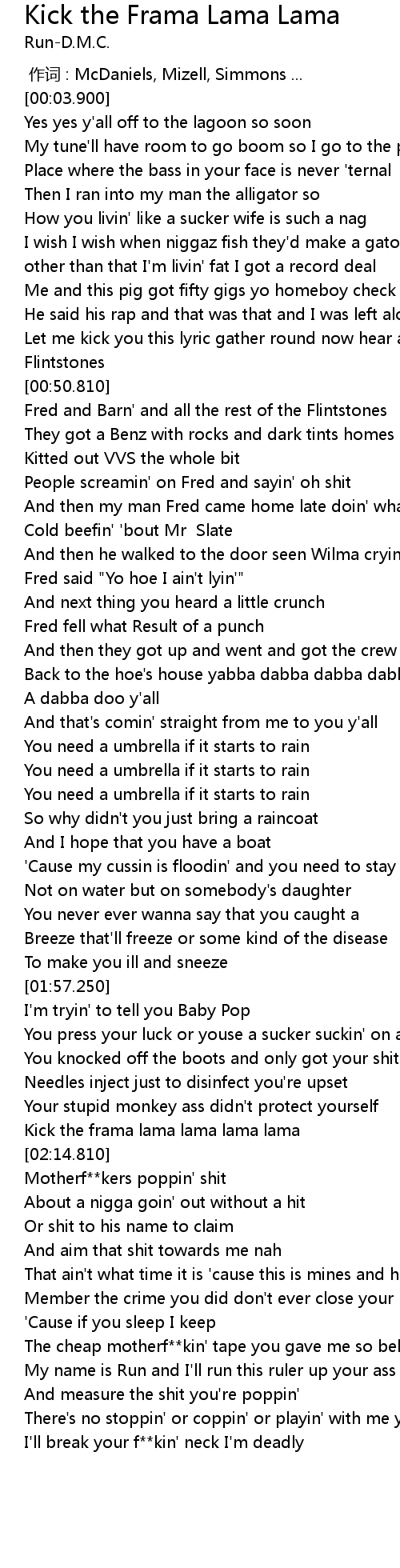 | [01:10.470] | Fred said "Yo hoe I ain't lyin'" |