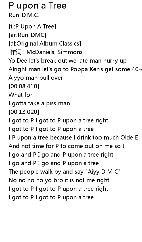 | [00:36.700] | I got to P I got to P upon a tree right |