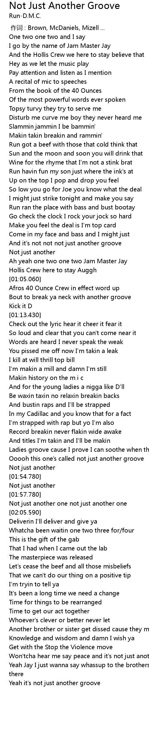 | [02:41.530] | Won' tcha hear me say peace and it' s not just another groove |