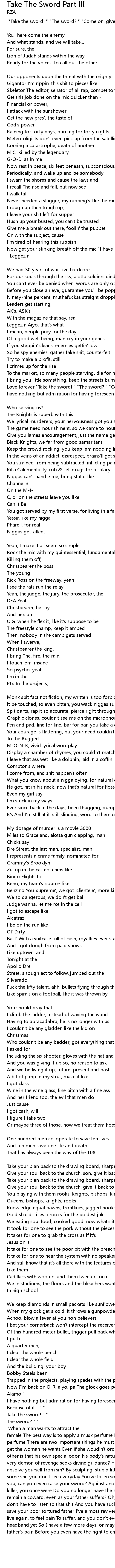 Or maybe three of those, how we treat them hoes "Take the sword! " "The sword? " "Come on, give me the sword! " "You Wu-Tang... " [Interlude: sample] |