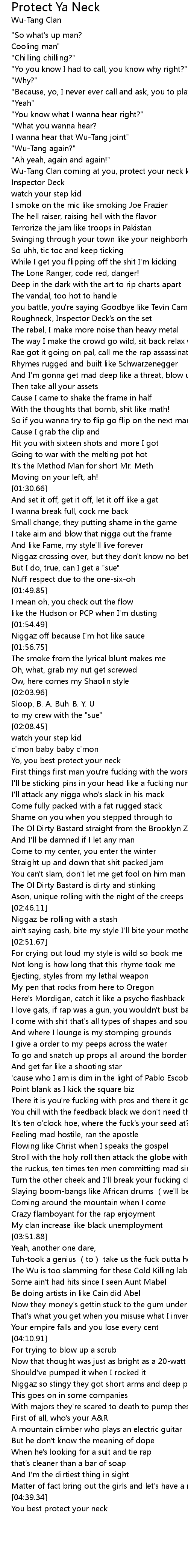 | [00:22.42] | Wu-Tang Clan coming at you, protect your neck kid, so set it off the Inspector Deck |